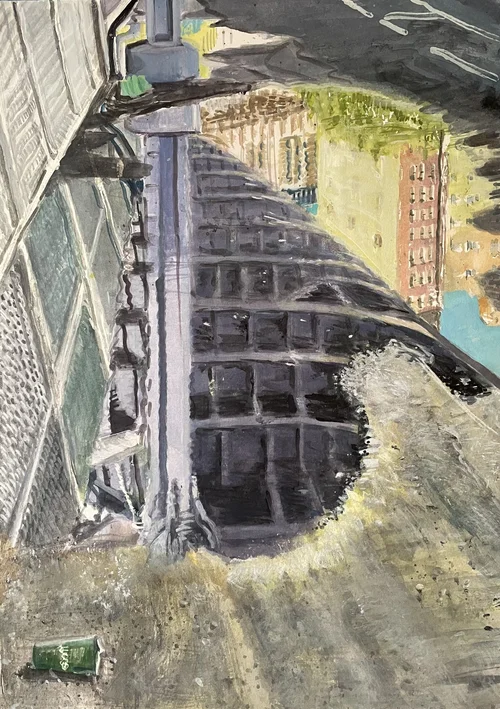 City Corner with Bird. watercolor on Paper, 21 x 14. 2023